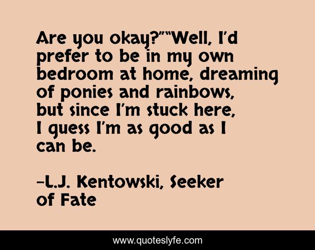 This page presents the quote "Are you okay?”“Well, I’d prefer to be in my own bedroom at home, dreaming of ponies and rainbows, but since I’m stuck here, I guess I’m as good as I can be.". Author of this quote is L.J. Kentowski, Seeker of Fate. This quote is about cassandra-cosgrove, seeker-of-fate, caleb, urban-fantasy, fate-2, paranormal-romance,.