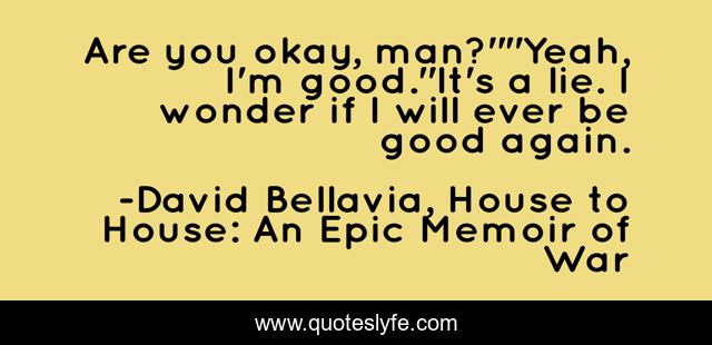 This page presents the quote "Are you okay, man?""Yeah, I'm good."It's a lie. I wonder if I will ever be good again.". Author of this quote is David Bellavia, House to House: An Epic Memoir of War. This quote is about lie, life, death, army, soldiers, military, terrorism, iraq, war,.