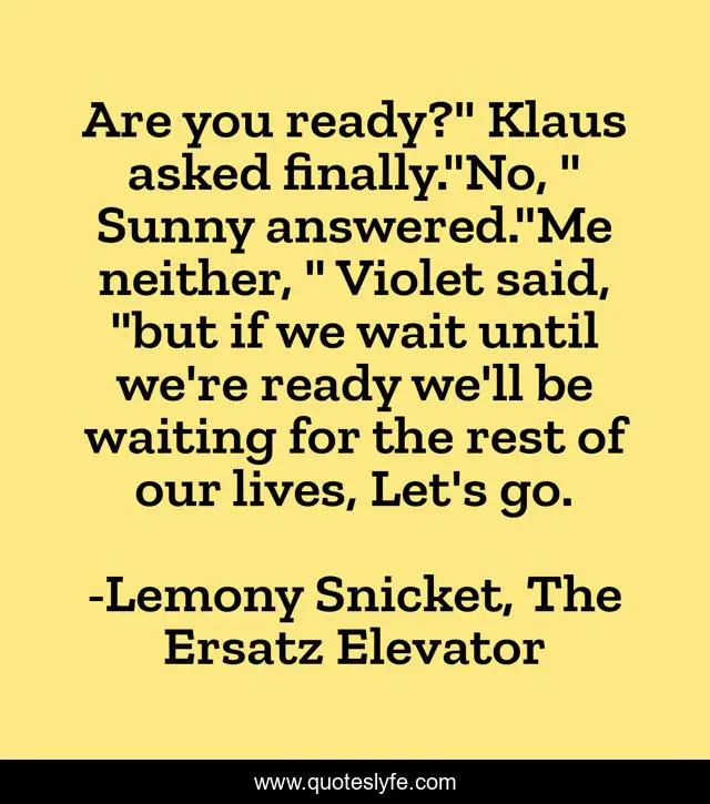 This page presents the quote "Are you ready?" Klaus asked finally."No, " Sunny answered."Me neither, " Violet said, "but if we wait until we're ready we'll be waiting for the rest of our lives, Let's go.". Author of this quote is Lemony Snicket, The Ersatz Elevator. This quote is about waiting, courage, ersatz-elevator, lemony-snicket,.
