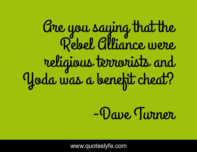This page presents the quote "Are you saying that the Rebel Alliance were religious terrorists and Yoda was a benefit cheat?". Author of this quote is Dave Turner. This quote is about star-wars, sci-fi, humour, how-to-be-dead,.