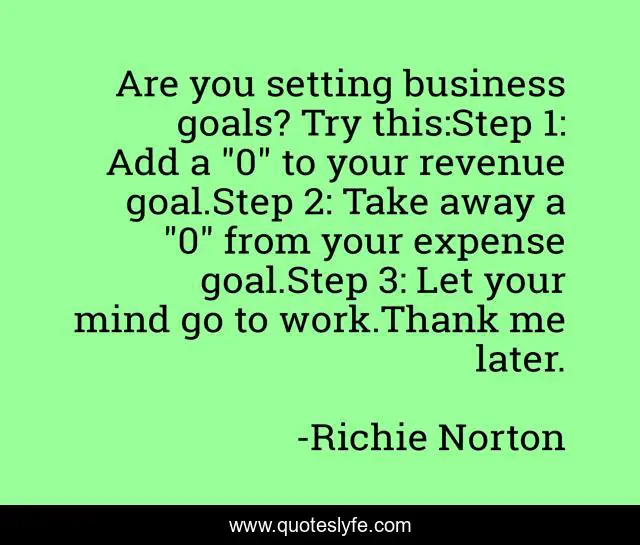 This page presents the quote "Are you setting business goals? Try this:Step 1: Add a "0" to your revenue goal.Step 2: Take away a "0" from your expense goal.Step 3: Let your mind go to work.Thank me later.". Author of this quote is Richie Norton. This quote is about confidence, self-mastery, mindful, marketing, work, success, self-help, entrepreneur, innovation,.