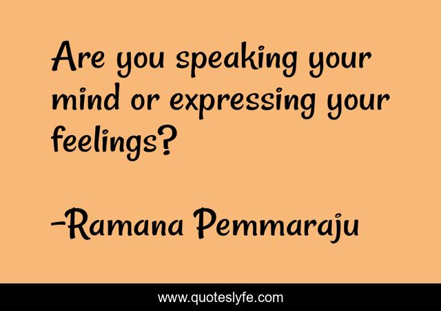 This page presents the quote "Are you speaking your mind or expressing your feelings?". Author of this quote is Ramana Pemmaraju. This quote is about expression-of-true-feelings, feelings-and-emotions, speaking-your-mind, feelings, expressing-yourself, expression, speaking,.