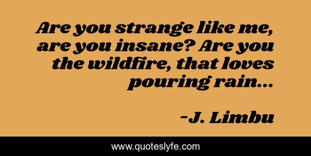 This page presents the quote "Are you strange like me, are you insane? Are you the wildfire, that loves pouring rain...". Author of this quote is J. Limbu. This quote is about stranger, love, tragedy, affection,.