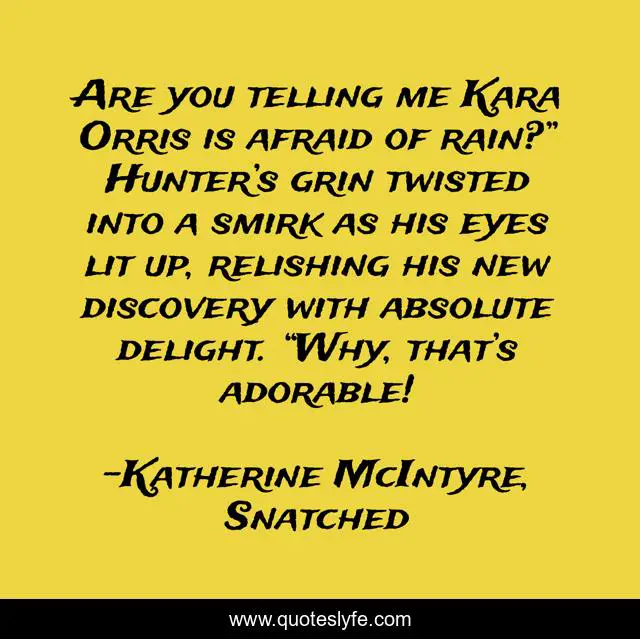 This page presents the quote "Are you telling me Kara Orris is afraid of rain?” Hunter’s grin twisted into a smirk as his eyes lit up, relishing his new discovery with absolute delight. “Why, that’s adorable!". Author of this quote is Katherine McIntyre, Snatched. This quote is about humor, post-apocalyptic, snark, rain,.