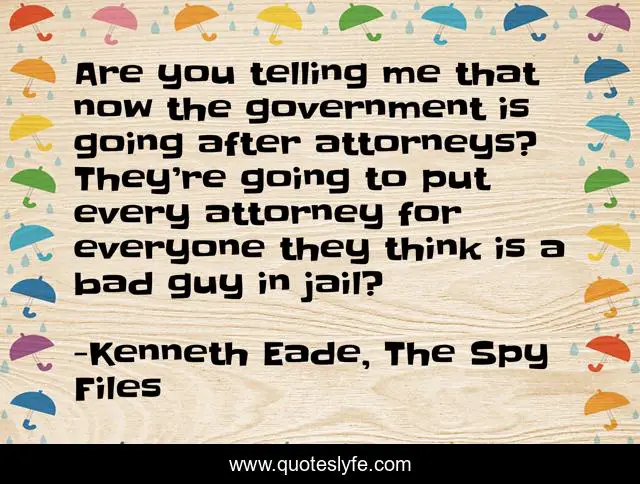 This page presents the quote "Are you telling me that now the government is going after attorneys? They’re going to put every attorney for everyone they think is a bad guy in jail?". Author of this quote is Kenneth Eade, The Spy Files. This quote is about attorneys, attorney-client-relationship, government,.