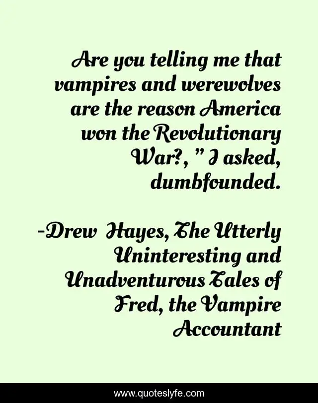 This page presents the quote "Are you telling me that vampires and werewolves are the reason America won the Revolutionary War?, ” I asked, dumbfounded.". Author of this quote is Drew Hayes, The Utterly Uninteresting and Unadventurous Tales of Fred, the Vampire Accountant. This quote is about wolf-shifters, undead, high-school-reunion, shifters, vampire, parahumans, zombies, monsters,.