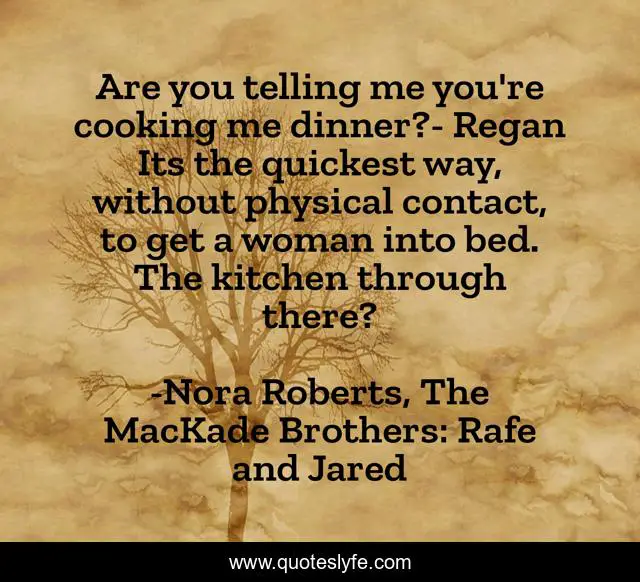 This page presents the quote "Are you telling me you're cooking me dinner?- Regan Its the quickest way, without physical contact, to get a woman into bed. The kitchen through there?". Author of this quote is Nora Roberts, The MacKade Brothers: Rafe and Jared. This quote is about romance, humor,.
