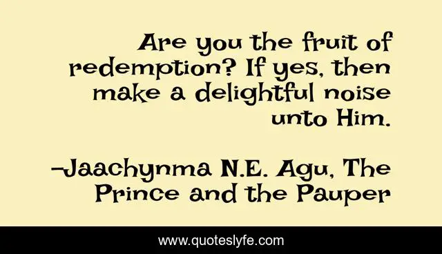 "Jaachynma N.E. Agu, The Prince and the Pauper Quotes." Quoteslyfe.com, 2025. Mon. 08 Dec. 2025. <https://www.quoteslyfe.com/quote/Are-you-the-fruit-of-redemption-If-28845>.