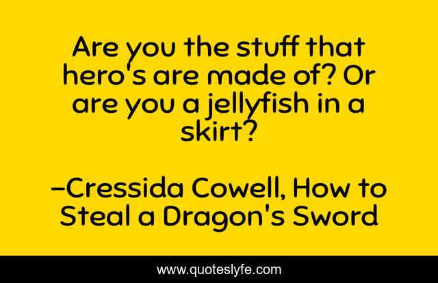 This page presents the quote "Are you the stuff that hero's are made of? Or are you a jellyfish in a skirt?". Author of this quote is Cressida Cowell, How to Steal a Dragon's Sword. This quote is about tribe, hero, humor, challenge, david-tennant, how-to-train-your-dragon, hiccup, hooligans, kamikaze,.