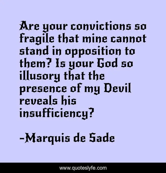This page presents the quote "Are your convictions so fragile that mine cannot stand in opposition to them? Is your God so illusory that the presence of my Devil reveals his insufficiency?". Author of this quote is Marquis de Sade. This quote is about atheism, god, religion,.