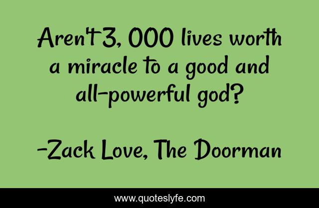 This page presents the quote "Aren't 3, 000 lives worth a miracle to a good and all-powerful god?". Author of this quote is Zack Love, The Doorman. This quote is about beautiful, faith, woman, alex, god, zack-love, new-york-city, hope, realization,.