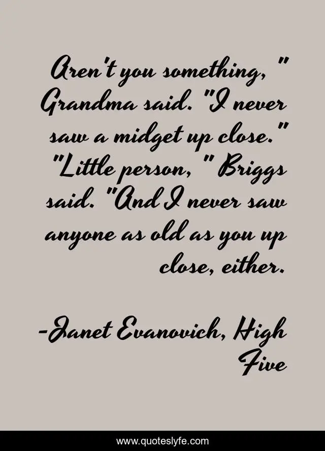 This page presents the quote "Aren't you something, " Grandma said. "I never saw a midget up close." "Little person, " Briggs said. "And I never saw anyone as old as you up close, either.". Author of this quote is Janet Evanovich, High Five. .