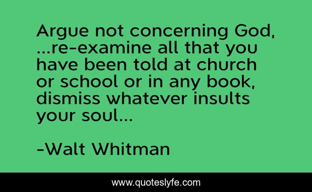 This page presents the quote "Argue not concerning God, …re-examine all that you have been told at church or school or in any book, dismiss whatever insults your soul…". Author of this quote is Walt Whitman. This quote is about religion, personal-faith, inspirational, enthusiasm,.