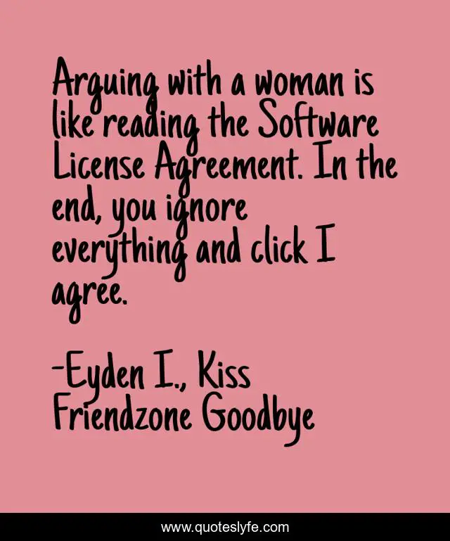 This page presents the quote "Arguing with a woman is like reading the Software License Agreement. In the end, you ignore everything and click I agree.". Author of this quote is Eyden I., Kiss Friendzone Goodbye. This quote is about arguing, software-license, woman, humor, agree,.