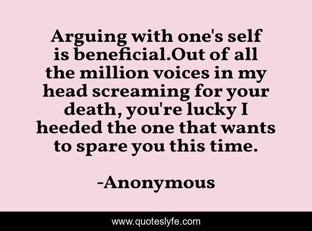 This page presents the quote "Arguing with one's self is beneficial.Out of all the million voices in my head screaming for your death, you're lucky I heeded the one that wants to spare you this time.". Author of this quote is Anonymous. This quote is about anger, death, mind, insanity,.