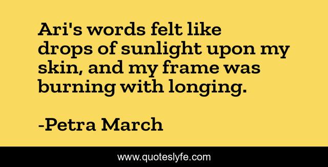 This page presents the quote "Ari's words felt like drops of sunlight upon my skin, and my frame was burning with longing.". Author of this quote is Petra March. This quote is about petra-march, a-touch-of-cinnamon, contemporary-literature, romance, young-adult-fiction, friendship-and-love, novella,.