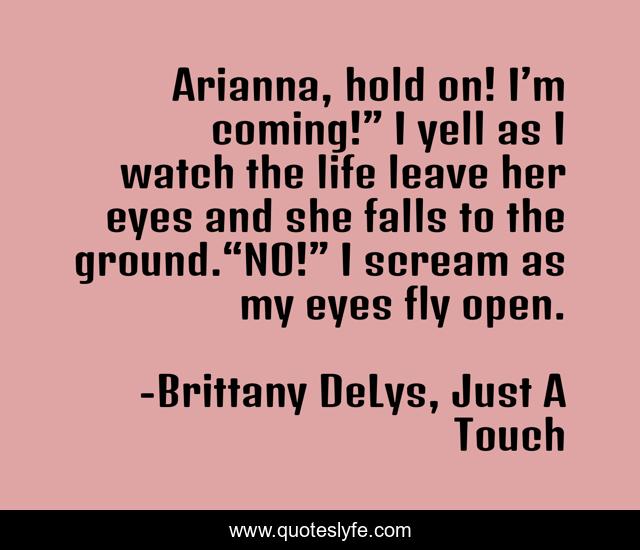 This page presents the quote "Arianna, hold on! I’m coming!” I yell as I watch the life leave her eyes and she falls to the ground.“NO!” I scream as my eyes fly open.". Author of this quote is Brittany DeLys, Just A Touch. This quote is about triad, dreams, chase,.