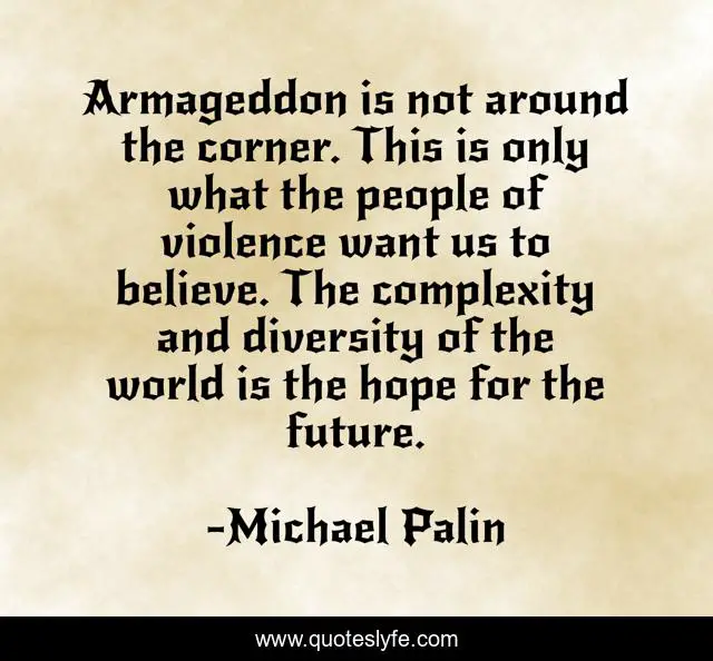 This page presents the quote "Armageddon is not around the corner. This is only what the people of violence want us to believe. The complexity and diversity of the world is the hope for the future.". Author of this quote is Michael Palin. This quote is about future, diversity, violence,.