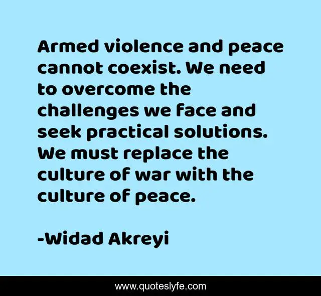 This page presents the quote "Armed violence and peace cannot coexist. We need to overcome the challenges we face and seek practical solutions. We must replace the culture of war with the culture of peace.". Author of this quote is Widad Akreyi. This quote is about enthusiasm, peace, war, inspirational,.