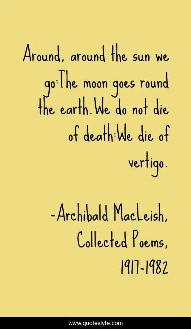 This page presents the quote "Around, around the sun we go:The moon goes round the earth.We do not die of death:We die of vertigo.". Author of this quote is Archibald MacLeish, Collected Poems, 1917-1982. This quote is about archibald-macleish, death, vertigo, mother-goose-s-garland,.