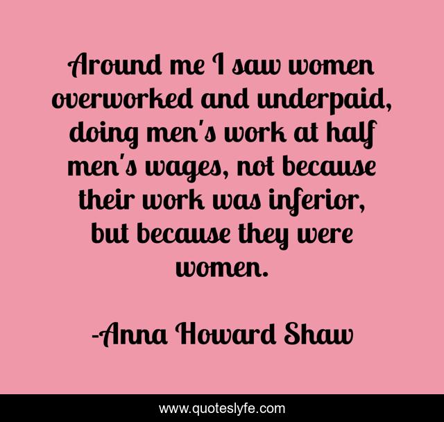 This page presents the quote "Around me I saw women overworked and underpaid, doing men's work at half men's wages, not because their work was inferior, but because they were women.". Author of this quote is Anna Howard Shaw. This quote is about me, work, men,.