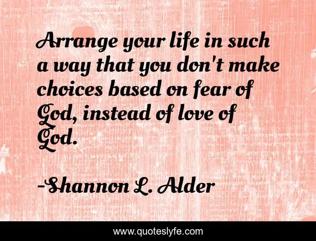 This page presents the quote "Arrange your life in such a way that you don't make choices based on fear of God, instead of love of God.". Author of this quote is Shannon L. Alder. This quote is about lessons, paths, fakeness, genuine, regret, blind-devotion, compassion, bitterness, brainwashed,.