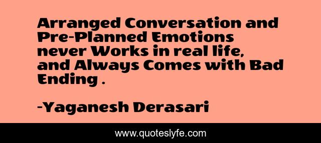 This page presents the quote "Arranged Conversation and Pre-Planned Emotions never Works in real life, and Always Comes with Bad Ending .". Author of this quote is Yaganesh Derasari. This quote is about conversations, relationship-advice, emotions, life-lessons,.