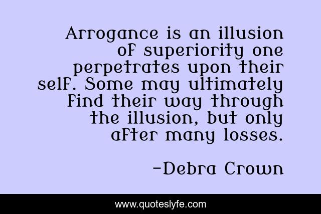 This page presents the quote "Arrogance is an illusion of superiority one perpetrates upon their self. Some may ultimately find their way through the illusion, but only after many losses.". Author of this quote is Debra Crown. This quote is about narcissism, superiority, illusion, arrogance,.