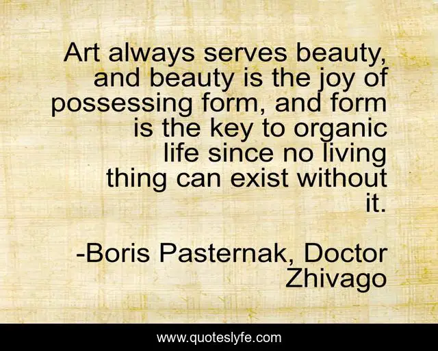 This page presents the quote "Art always serves beauty, and beauty is the joy of possessing form, and form is the key to organic life since no living thing can exist without it.". Author of this quote is Boris Pasternak, Doctor Zhivago. This quote is about art, beuty,.