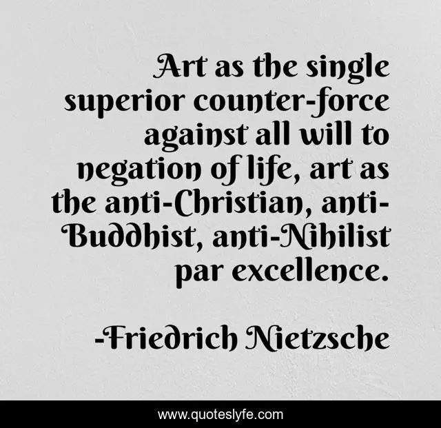 This page presents the quote "Art as the single superior counter-force against all will to negation of life, art as the anti-Christian, anti-Buddhist, anti-Nihilist par excellence.". Author of this quote is Friedrich Nietzsche. .