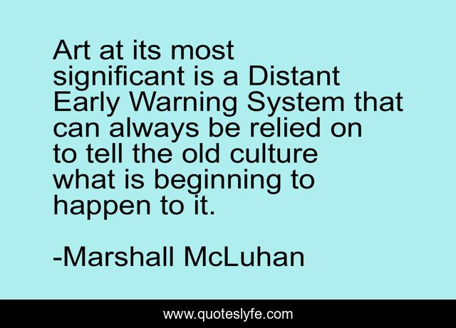 This page presents the quote "Art at its most significant is a Distant Early Warning System that can always be relied on to tell the old culture what is beginning to happen to it.". Author of this quote is Marshall McLuhan. This quote is about art, artist,.