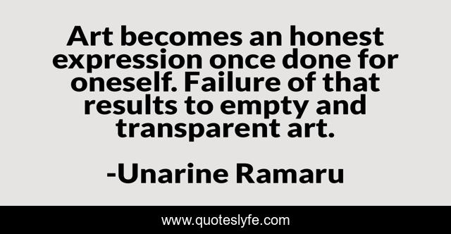 This page presents the quote "Art becomes an honest expression once done for oneself. Failure of that results to empty and transparent art.". Author of this quote is Unarine Ramaru. This quote is about life, art, oneself, artist, emptyness, results, honest, failure, expression,.