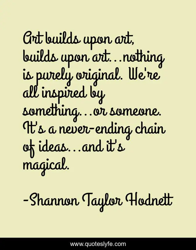 This page presents the quote "Art builds upon art, builds upon art...nothing is purely original. We're all inspired by something...or someone. It's a never-ending chain of ideas...and it's magical.". Author of this quote is Shannon Taylor Hodnett. This quote is about art, magical, never-ending, ideas, originality, inspiration,.