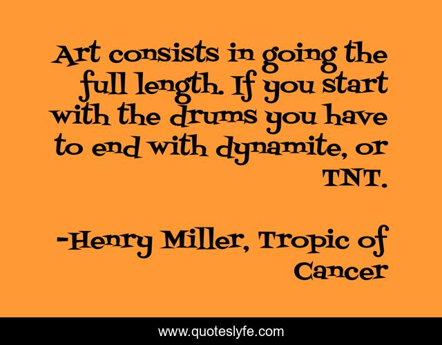 This page presents the quote "Art consists in going the full length. If you start with the drums you have to end with dynamite, or TNT.". Author of this quote is Henry Miller, Tropic of Cancer. This quote is about extremes, art,.