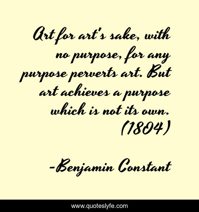 This page presents the quote "Art for art's sake, with no purpose, for any purpose perverts art. But art achieves a purpose which is not its own. (1804)". Author of this quote is Benjamin Constant. This quote is about art-for-art-s-sake, art,.