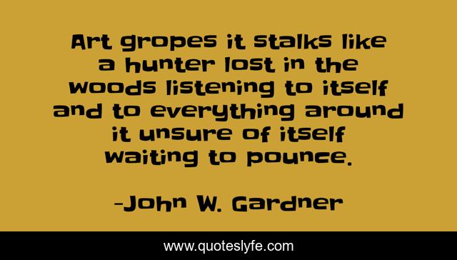 This page presents the quote "Art gropes it stalks like a hunter lost in the woods listening to itself and to everything around it unsure of itself waiting to pounce.". Author of this quote is John W. Gardner. This quote is about art, artist,.