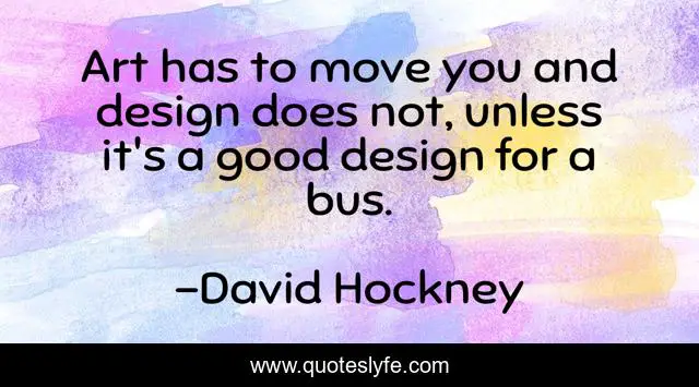 This page presents the quote "Art has to move you and design does not, unless it's a good design for a bus.". Author of this quote is David Hockney. This quote is about good, art,.
