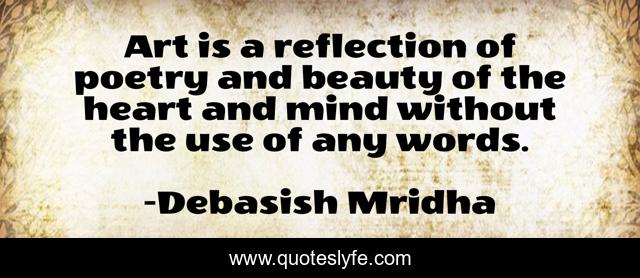 This page presents the quote "Art is a reflection of poetry and beauty of the heart and mind without the use of any words.". Author of this quote is Debasish Mridha. This quote is about debasish, art, mridha, philosophy, debasish-mridha, without-any-words, heart-and-mind, reflection-of-poetry, definition-of-art,.