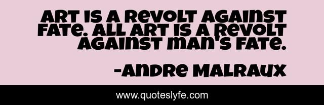 This page presents the quote "Art is a revolt against fate. All art is a revolt against man's fate.". Author of this quote is Andre Malraux. This quote is about fate, against, man,.