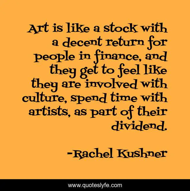 This page presents the quote "Art is like a stock with a decent return for people in finance, and they get to feel like they are involved with culture, spend time with artists, as part of their dividend.". Author of this quote is Rachel Kushner. This quote is about culture, art, time,.