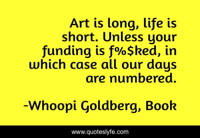 This page presents the quote "Art is long, life is short. Unless your funding is f%$ked, in which case all our days are numbered.". Author of this quote is Whoopi Goldberg, Book. This quote is about funding-the-arts, life, art,.