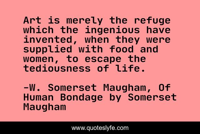 This page presents the quote "Art is merely the refuge which the ingenious have invented, when they were supplied with food and women, to escape the tediousness of life.". Author of this quote is W. Somerset Maugham, Of Human Bondage by Somerset Maugham. This quote is about life, art,.