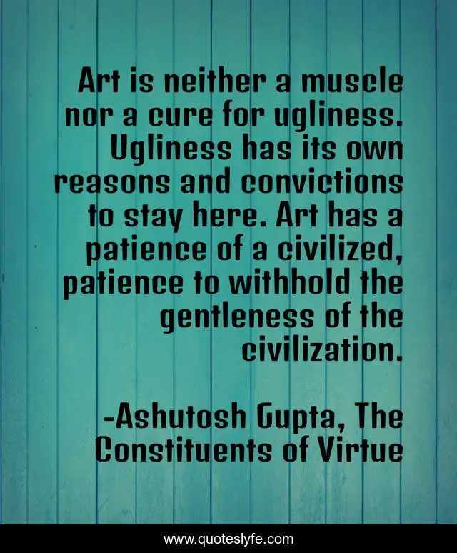 This page presents the quote "Art is neither a muscle nor a cure for ugliness. Ugliness has its own reasons and convictions to stay here. Art has a patience of a civilized, patience to withhold the gentleness of the civilization.". Author of this quote is Ashutosh Gupta, The Constituents of Virtue. This quote is about life, art, philosophy, wisdom, natire, inspirational, enthusiasm,.