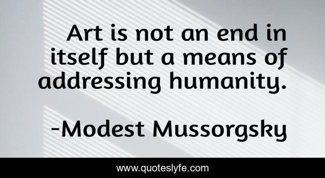 This page presents the quote "Art is not an end in itself but a means of addressing humanity.". Author of this quote is Modest Mussorgsky. This quote is about art, artist,.