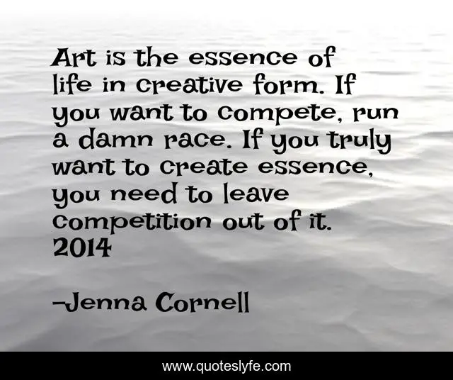 This page presents the quote "Art is the essence of life in creative form. If you want to compete, run a damn race. If you truly want to create essence, you need to leave competition out of it. 2014". Author of this quote is Jenna Cornell. This quote is about art, creativity-and-attitude, creativity, competition, inspirational, enthusiasm,.