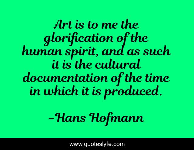 This page presents the quote "Art is to me the glorification of the human spirit, and as such it is the cultural documentation of the time in which it is produced.". Author of this quote is Hans Hofmann. This quote is about me, human spirit, time,.