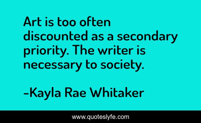 This page presents the quote "Art is too often discounted as a secondary priority. The writer is necessary to society.". Author of this quote is Kayla Rae Whitaker. This quote is about writers-on-writing, writing-life, writing,.