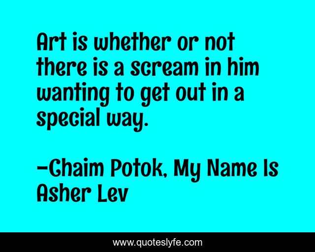 This page presents the quote "Art is whether or not there is a scream in him wanting to get out in a special way.". Author of this quote is Chaim Potok, My Name Is Asher Lev. .
