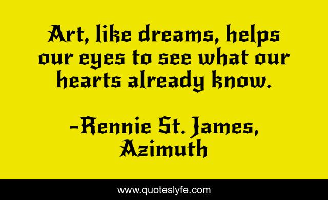 This page presents the quote "Art, like dreams, helps our eyes to see what our hearts already know.". Author of this quote is Rennie St. James, Azimuth. .