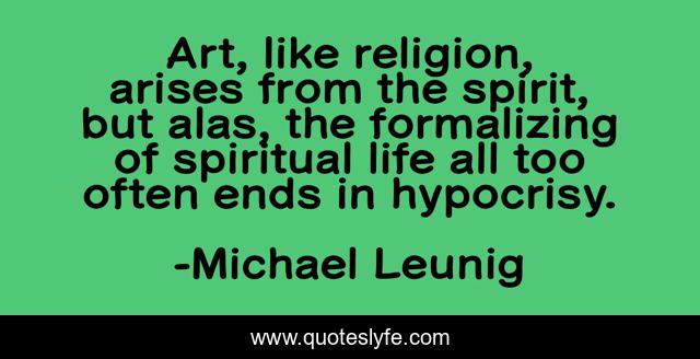 This page presents the quote "Art, like religion, arises from the spirit, but alas, the formalizing of spiritual life all too often ends in hypocrisy.". Author of this quote is Michael Leunig. This quote is about life, art, spiritual,.